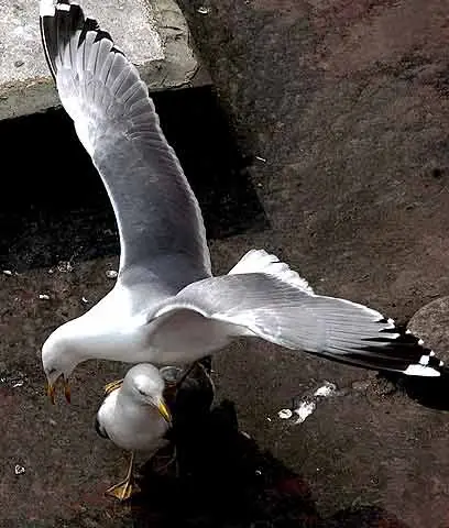 Una pareja de gaviotas en su ritual de apareamiento en un tejado de Varna, Bulgaria.