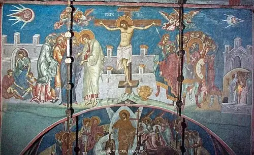"La Crucifixión" pintada en 1350. Dos objetos con figuras dentro se pueden ver en la parte superior a izq. y derecha del fresco. Se muestran dos agrandamientos de estos objetos. La pintura al fresco se localiza sobre el altar del Monasterio de Decani, en Kosovo, Yugoslavia.