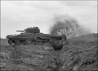 Entre ellas, el Tanque Mayal o barre-minas Sherman, apodado "El Cangrejo", Estaba diseñado para abrir senderos para la infantería a través de campos minados. Los mayales eran cadenas macizas sujetas a un tambor metálico de 3 metros montado en la parte delantera del tanque. Mientras el tanque avanzaba a unos 2,5Km/H su tambor giraba a gran velocidad y el peso de la bola del extremo se estrellaba contra el suelo y explotaba las minas de hasta nueve pulgadas de profundidad.