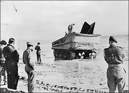 El inventor húngaro Nicholas Straussler desarrolló el tanque flotante que era un carro Sherman de 33Tm equipado con hélices en la parte trasera y llamado DD por su "Duplex Drive" del motor, que movía las cadenas en tierra y las hélices en el mar. El sistema consistía en una pantalla de tela sencilla, que podía levantarse para cubrir la parte superior del tanque. Esta pantalla inflada mediante tubos de goma desplazaba suficiente agua para hacer flotar el tanque. Los americanos lo llamaban "Pato Donald".