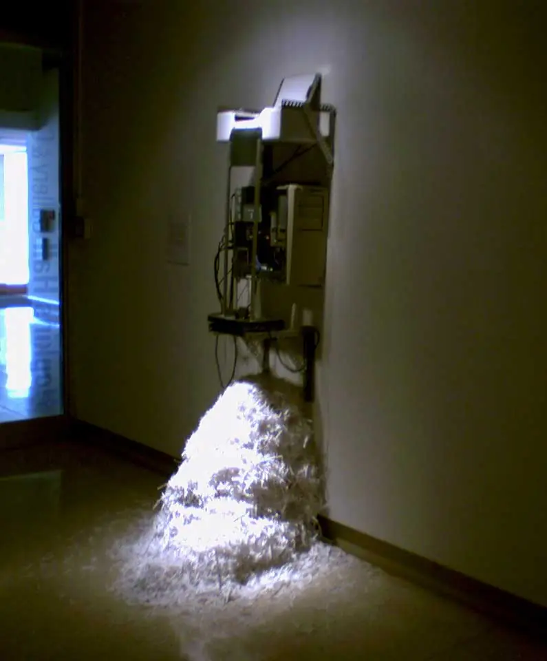 "Spamtrap" is an interactive installation piece that prints, shreds and blacklists spam email. It interacts with spammers by monitoring several email addresses I created specifically to lure in spam and an old unused personal email address I use to lure in spam. I do not use these email addresses for any other communication. I post these individual email addresses on websites and online bulletin boards that cause them to be harvested by spambots and then to start receiving spam.