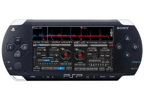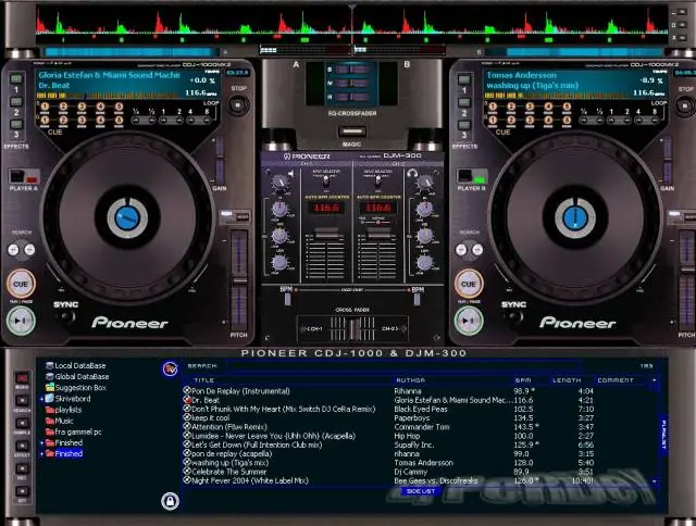 Se muestra como dos platinas (tocadiscos) asociados a una mesa de mezclas central. Incluye controles de PITCH, ecualización (altos, medios, graves), muestras gráficas de las canciones, gestor de listas de reproducción, efectos de audio y vídeo, sampler,...