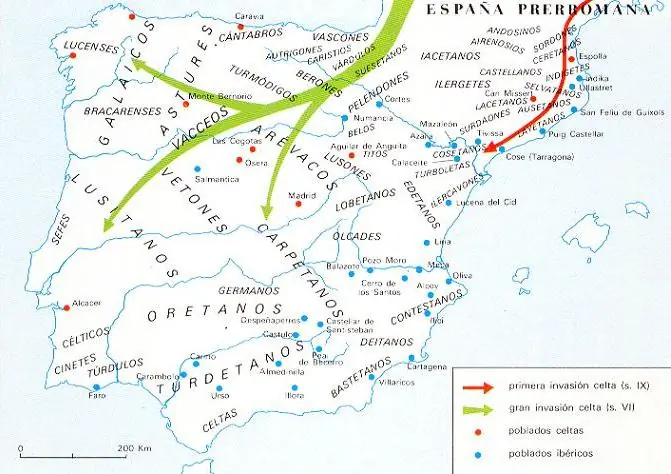 El pueblo más numeroso eran los Iberos, que estaban asentados en la vertiente mediterránea y el atlántico meridional. Hacia el año 1000 a.e.c. entraron en la península los Celtas, y se asentaron en el norte y el oeste de la península.