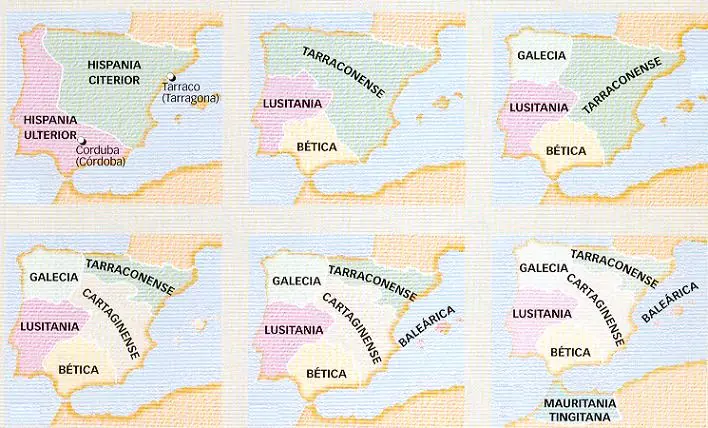 En el 19 a.e.c. Augusto reorganiza la península y la divide en tres provincias: Bética, lusitana y Tarraconense. En el 216 Caracalla añade una provincia, la Galecia. En el 285 Dioceclano subdivide la Hispania en cinco provincias: Bética, Lusitana, Galecia, Cartaginense y Tarraconense. Pocos años después se crea una nueva provincia, la Baleárica; y luego se añade otra, la séptima, la Mauritania Tingitana