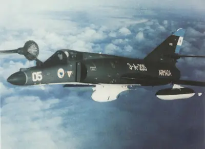 Armamento: Dos cañones DEFA de 30 mm. o cañones de 7,62 mm. en contenedores Macchi y hasta 1.800 kg. de bombas y cohetes en seis soportes subalares con capacidad cada uno de 340 kg. para transportar napalm, AS-11-, AS-12, Magic; o un sólo contenedor de reconocimiento para transportar cuatro cámaras fotográficas. En el extremo de las alas puede llevar tanques suplementarios de combustible. Durante el conflicto se le adaptaron soportes para coheteras de 5 pulgadas.