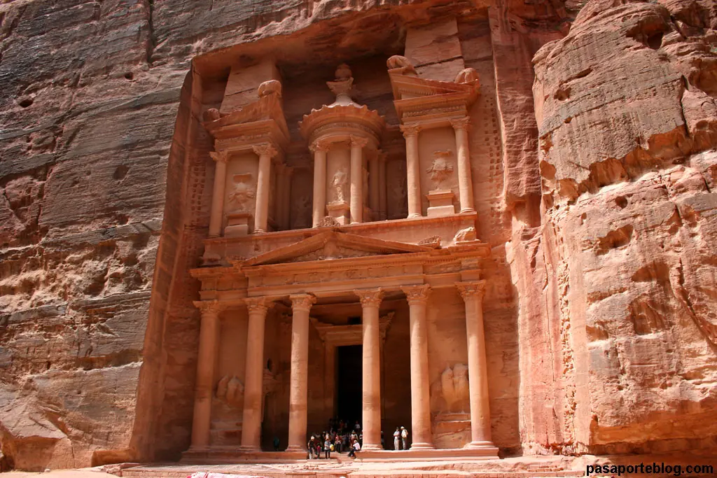 Petra es un yacimiento arqueológico en Jordania. Son los restos de la capital del antiguo reino nabateo, fundada hacia el 300 antes de Cristo. Sus restos más famosos son los edificios labrados en la misma piedra de las paredes rocosas del angosto valle de la Aravá.