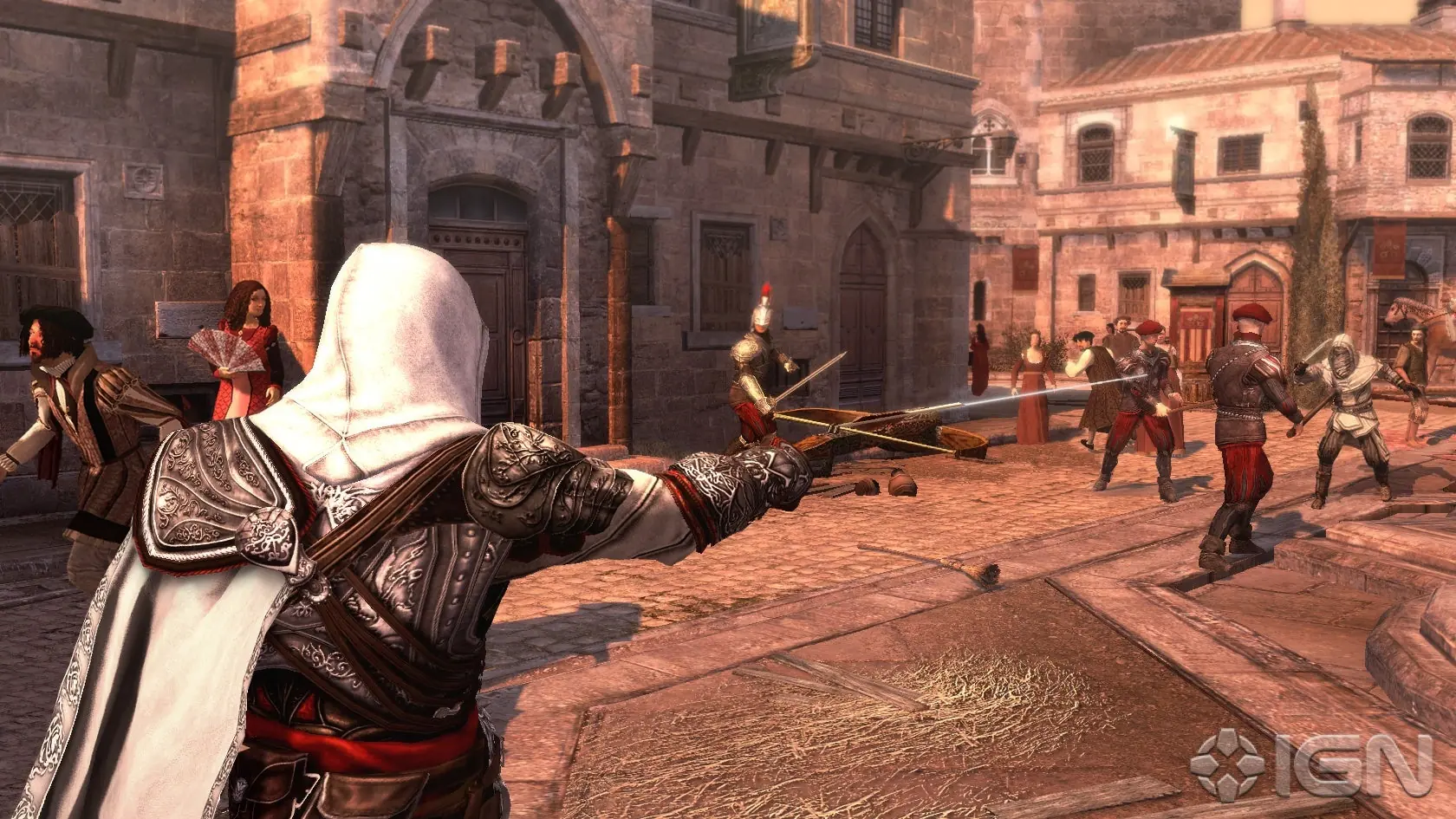 Sin embargo La Hermandad no deja de ser un Assassin’s Creed al uso, y volveremos a tener que llevar a cabo la mayoría de las misiones por nuestro propio pie; empleando el sigilo y la sutileza para salir del paso. Para ello habrá armas que debutarán y otras que repetirán como los dardos envenenados, los paracaídas, las dagas ocultas, las pistolas, las jeringuillas y, por supuesto, la máquina voladora. El componente histórico volverá a estar muy presente en Assassin’s Creed: La Hermandad, y es que la ciudad de Roma va a estar cuidada hasta la extenuación, el realismo será la nota predominante en los diseños de los escenarios y en el comportamiento de sus ciudadanos y, por si fuera poco, volveremos a vernos con personajes históricos de la talla de un Leonardo da Vinci que regresa, o de Nicolás Maquiavelo o Caterina Sforza.