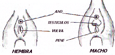 Para reconocer una hembra, veremos que la vulva está inmediatamente por debajo del ano, no hay ningún espacio entre ellos y no sobresale. Para reconocer un macho, entre el ano y los genitales hay un espacio, mínimo en el recién nacido, que corresponde a los testículos, y además, el pene dentro de su prepucio sobresale (muy poco en los neonatos).
