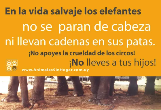 Los circos siempre son radiantes ante los niños que anhelan que sus papas los lleven a ver el gran show de los animales sin saber el abuso al que son sometidos estos animales, que si saliera al aire públicamente el modo de entrenamiento que se les da, pues son castigados a latigazos o toques para que respondan a las órdenes de sus entrenadores, si el publico presenciara algún día una de estas escenas estos circos perdería todo su atractivo, pues aparte de que estos animalitos son sometidos y entrenados con maltrato físico, por lo regular no se les da la atención médica como se debe, ni la comida que requieren este tipo de animales como lo son; los elefantes, tigres, leones por decir algunos, que requieren de una costosa alimentación.