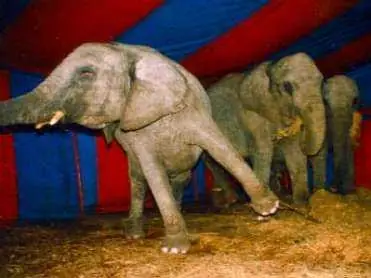 Elefantes: se utiliza el ancush, un instrumento metálico de dos puntas que se les clava detrás de las orejas, en la panza y en los genitales. También se usa picana a pilas camufladas. Mientras no actúan se los inmovilizan con grilletes. En general, se les cortan los colmillos. (Hermano Oso & Hermana Flor)