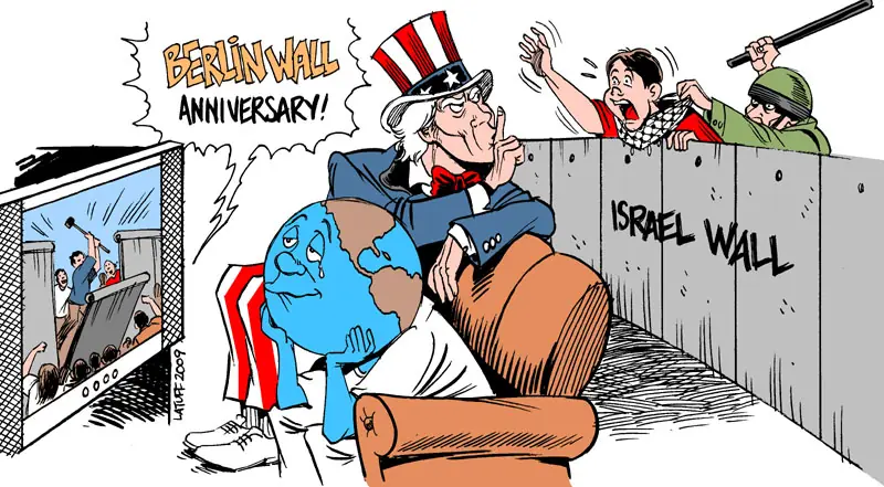 El nuevo Muro en Cisjordania, expropia la mitad de la zona, principalmente las partes más significativas de agua, tierras y demás recursos de interés, cercando, aislando y fragmentando a la familia palestina. Eso sin decir que la construcción de este Muro de la Vergüenza ha sido condenada, y fue declarado ilegal hasta por el Tribunal Internacional de La Haya. ¡Palestinos encerrados en su propia patria!