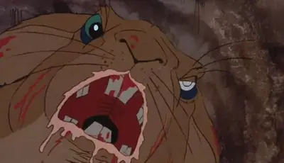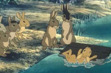 Dejando a un lado a este villano, que es un tirano que tiene sometido a todo su pueblo, hacinado en una madriguera y vigilado por soldados casi tan crueles como él, y que tiene frases tan lindas como “cuando te atrape te voy a sacar los ojos”, la película está plagada de personajes oscuros. El que se lleva la palma es un conejo con pinta algo enfermiza que sufre visiones cada vez que la manada está en peligro mortal: desde ver los campos llenos de sangre hasta oír sonidos que le provocan ataques catalépticos. Luego está el soldado acostumbrado a despachar de dos zarpazos a todo aquel que se ponga en su camino, el pájaro que pregunta insistentemente dónde están las chicas del grupo, el líder capaz de llevarse a un compañero que le sirva de cebo a una misión de reconocimiento… Vamos, comportamientos que son certeros análisis de la conducta humana más cuestionable, pero que no son precisamente adecuados como modelos de conducta para los infantes. Y eso dejando aparte que es una película llena de sangre y violencia explícita y nada edulcorada. Que un conejo gigante asesino ataque a otro berreando y mordiéndole en el cuello hasta dejarlo hecho un guiñapo sanguinolento sólo es comparable a cuando llega el perro, agarra a un conejo y lo lanza a diez metros de distancia con las tripas fuera. De repente, la escena de los Monty Python no parece tan descabellada…
