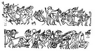 También se han hallado figuritas que reproducen a arpistas que apoyan el instrumento musical en grandes y erectos penes. Otras pinturas muestran fiestas de la realeza en las que grupos de bellas bailarinas prácticamente desnudas ejecutan enigmáticas danzas.