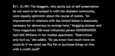 “Los blogueros, que en parte por su propia preservación no quieren estar agrupados con la comunidad disidente, estaban igualmente optimistas acerca del curso de los acontecimientos. ‘Una mejora de las relaciones con los Estados Unidos es absolutamente necesaria para que surja la democracia aquí’, le dijo a Williams en su modesto apartamento la pionera de los blogs y una de las 100 personas más influyentes según la revista Time, XXXXXXXXXXXX: ‘Las restricciones sólo nos hacen daño’, y añadió. ‘¿Sabe cuánto más podríamos hacer si pudiéramos usar Pay Pal o comprar cosas on-line con una tarjeta de crédito? “