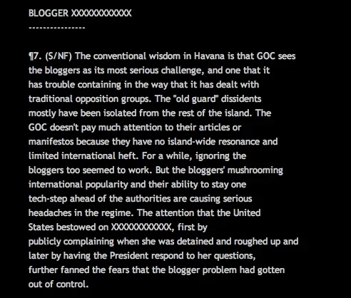 Cable del 1 de junio de 2010 emitido desde la SINA al Departamento de Estado. Tachan el nombre de la bloguera, pero queda identificada al aludir a la entrevista que le concediera el Presidente Barack Obama. Por cierto, es la única que el primer "ciberpresidente" de la historia de EEUU le ha concedido a un bloguero, hecho que generó controversias en su país por esta inusitada deferencia.