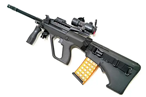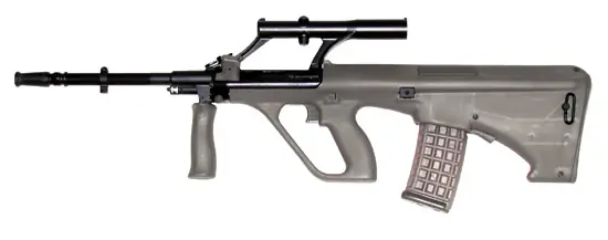 El Steyr AUG es un fusil de asalto, introducido en 1977 por la compañía austriaca Steyr Mannlicher, reemplazando al StG 58 de 7,62 mm. AUG significa Armee Universal Gewehr, que podría ser traducido como "fusil universal del ejército". Se utiliza a menudo para referirse a una versión específica, especialmente a la versión de fusil de asalto Bullpup de la OTAN, que utiliza la munición 5,56 x 45 mm OTAN, con un marco verde distintivo y una mira táctica integrada. Tiene una variedad de modelos para cada tipo de misión, ha sido adoptado por numerosas fuerzas y organizaciones armadas, y es el rifle estándar en servicio de Austria, Australia, Nueva Zelandia, Luxemburgo, Irlanda, Malasia y Uruguay (éste último país se encuentra incorporándolos a julio de 2008). También Argentina posee cierto numero de éstos, al llegar un cargamento junto con los tanques SK-105.