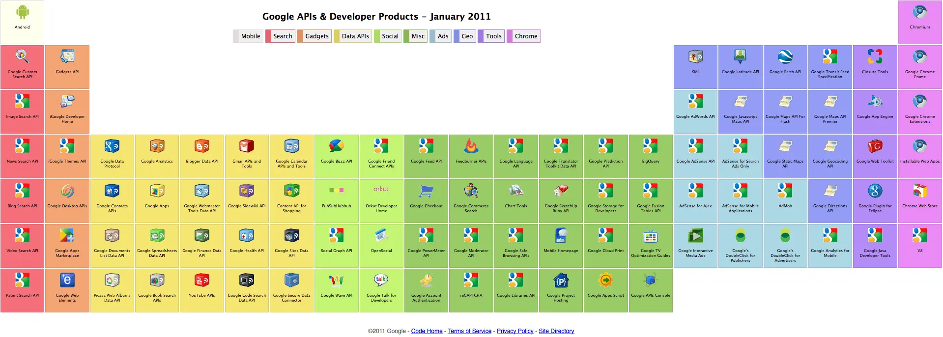 Muy bien montada, divertida y útil esta ‘tabla periódica‘ que se ha montado Google para facilitar el acceso de los usuarios y desarrolladores a sus API.