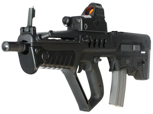 * En los fusiles de asalto TAR-21 y F2000, la mira de punto rojo es sustituida por una mira MARS.