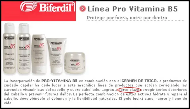 dijo:El ‘corto plazo’ al que se refiere este tratamiento es el necesario para que la cantidad ínfima de vitamina pueda llegar a absorberse en el cuero cabelludo y mejore la calidad del nuevo pelo en crecimiento. Si el folículo se encuentra en fase anágena y de crecimiento sano, una melena femenina y joven de unos 12 centímetros puede crecer, con suerte, en algo más de un año. Para entonces el aporte sanguíneo de vitaminas y aminoácidos de la dieta será infinitamente más decisivo que la pequeña ósmosis sufrida por vía tópica.