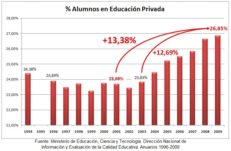 Según cifras oficiales, los establecimientos de Educación Privada incrementaron su porcentaje de cobertura de alumnos dentro de la matrícula total. En los 90s esos porcentaje se mantuvieron parejos, principalmente por el incremento en la cantidad de estudiantes hacia ambas modalidades, pública y privada. Veremos, en un post posterior, que desde el 2003 la matrícula estatal se estancó mientras creció la Privada (sin embargo, a un ritmo inferior al crecimiento poblacional, con lo cual hoy hay una menor cobertura que hace 10 años). Demás está decir que también crecieron los enormes subsidios desde el Estado. Como conclusión, también en este aspecto, vemos el verdadero carácter del kirchenrismo detrás de la demagogia "nacional y popular". Así como los incrementos presupuestarios en el área se han logrado con numerosas huelgas todos estos años (por ejemplo, aquella histórica huelga docente de Santa Cruz en 2006, la cual recogió la solidaridad de todo el pueblo, quebró la política oficial que incluyo la militarización de las escuelas, y consiguió subir el Básico Docente congelado desde 1991 -Kirchner gobernador- en $161), aprendamos de esto que es con la lucha, la organización y una verdadera política de izquierda, independiente de las patronales y sus políticos, el camino por el cual avanzaremos en los derechos del pueblo trabajador.