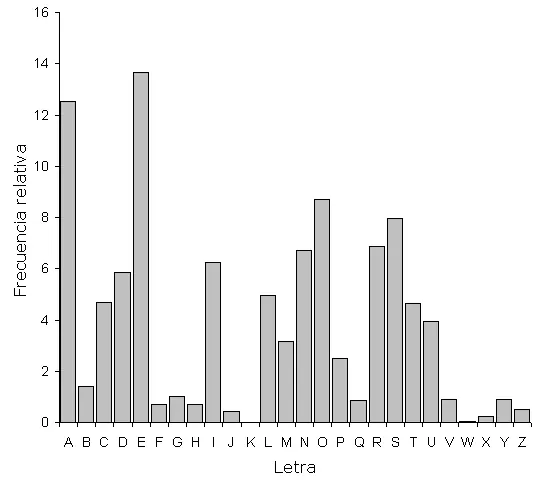 En español, las vocales son muy frecuentes, ocupando alrededor del 45% del texto, siendo la E y la A las que aparecen en más ocasiones, mientras que la frecuencia sumada de F, Z, J, X, W y K no alcanza el 2%. La regla mnemotécnica para el español sería "EAOSR NIDLC" o bien "EAOSN RILDUT".