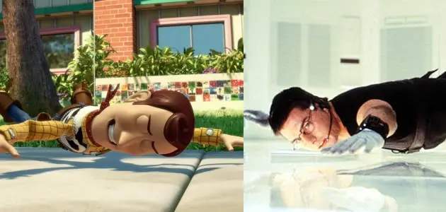 Cuando Woody escapa y cae en un árbol, lo hace similar a Tom Cruise en Misión Imposible