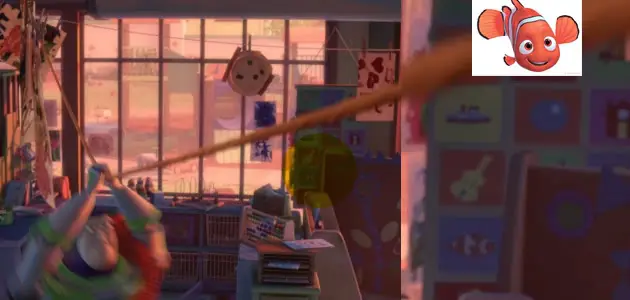 Para salir del Salón Oruga Buzz pasa rápidamente por una cuerda y al fondo hay dibujos relacionados con Finding Nemo