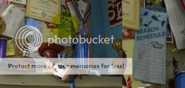 en una vista panorámica se distingue perfecta parte de la recámara en donde podemos ver un banderín con las iniciales PU (Pixar University):