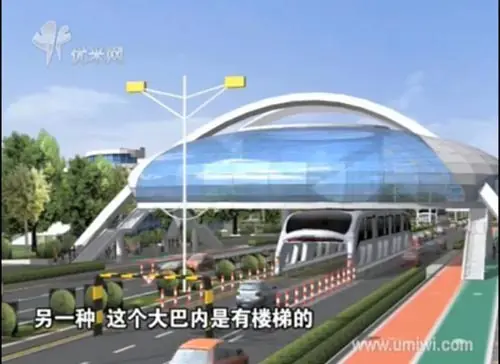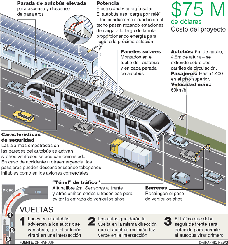 China prepara la implantación de lo que ya denominan "el autobús del futuro". Se trata de un nuevo vehículo cuya altura es de unos 4,25 metros y que incluye un hueco en su interior que permite el tránsito de coches y evita las conglomeraciones. El "túnel ambulante" se llama "3-D Fast Bus", puede transportar hasta 1.200 pasajeros y su velocidad rondaría en los 40 kilómetros por hora.