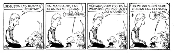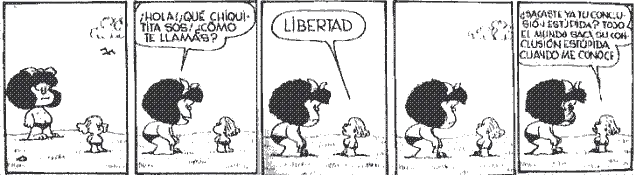 Libertad fue el ultimo personaje de la tira. Se puede denominar a Libertad como una Mafalda pero en version mas radical, mas restrictiva. Segun Quino Libertad representa la idem. Es la mas chiquita del grupo y le revienta la gente alta. Ademas a ella le gusta la gente simple cosa que contradice enrevesandose cuando habla. Su madre es traductora de libros en frances y viven en un pequeño apartamento pero se esfuerzan en demostrar que es mas grande de lo que aparenta.