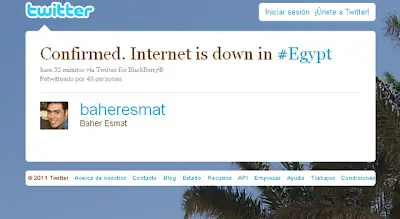 "Existe el riesgo de que mañana Egipto amanezca desconectado del mundo, sin Internet y sin telefonía móvil. Ya han censurado twitter, facebook y gchat, y ahora Blackberry 3G.