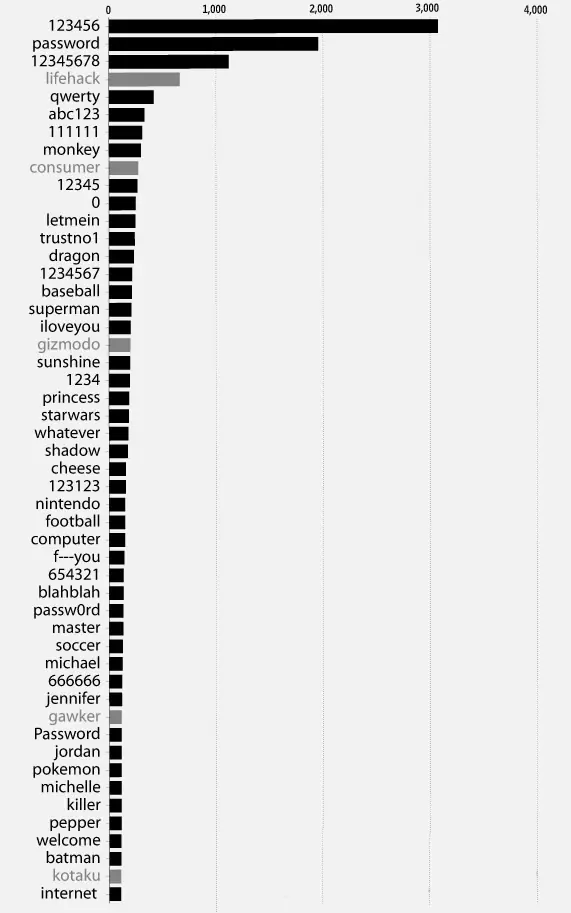 red, como lifehacker o Gizmodo fueron vulnerados y su base de datos publicada en internet, junto con la información en texto plano de la información personal ingresada por sus usuarios, la siguiente tabla muestra una vez mas como el usuario promedio sigue usando las mismas claves una y otra vez, aunque se les advierta que hacen parte de las peores contraseñas de todos los tiempos.