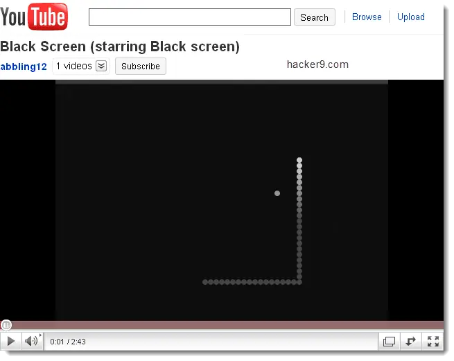 Salido de un imaginario departamento de complementos intrascendentes (fijo que de ahí salieron las vuvuzelas que hubo durante el mundial), nos viene ahora la posibilidad de jugar el clásico Snake en YouTube. Cuando abráis cualquier vídeo, dadle a pausa y mantened pulsada la tecla de la flecha izquierda para que aparezca la serpiente que se hace más grande con cada nuevo punto que devora.