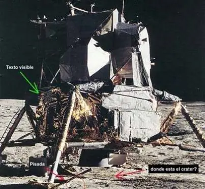 Cuando este Módulo Lunar se posó en la Luna no produjo ningún cráter entre sus patas, a pesar de la considerable cantidad de polvo que debía haber levantado durante su descenso. Debajo del Módulo hay una pisada, a pesar de que nadie anduvo por esa parte de la Luna antes del descenso del vehículo. A la izquierda del Módulo se ven las palabras: United States, aunque están en la sombra. Buzz Aldrin dijo que no había refracción de la luz, lo que indica que se empleo otra fuente luminosa.
