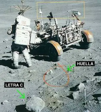 El astronauta de espaldas es John Young, reajustando una antena junto al vehículo de Exploracion Lunar (VEL). Si observa con detalle se dará cuenta que el vehículo hizo un giro de 90 grados en forma recta. Da la impresión de que fue movido y puesto en ese lugar. En la roca que se observa, esta impresa la letra C, parece que alguien se olvidó de esconder la marca del decorado. Debajo esta una ampliacion de las Líneas de Marca (las cruces), estan son producidas por la camara fotográfica. Pero si observa bien la marca de la izquierda esta debajo de una de las antenas del VEL. ¿Cómo es posible?.