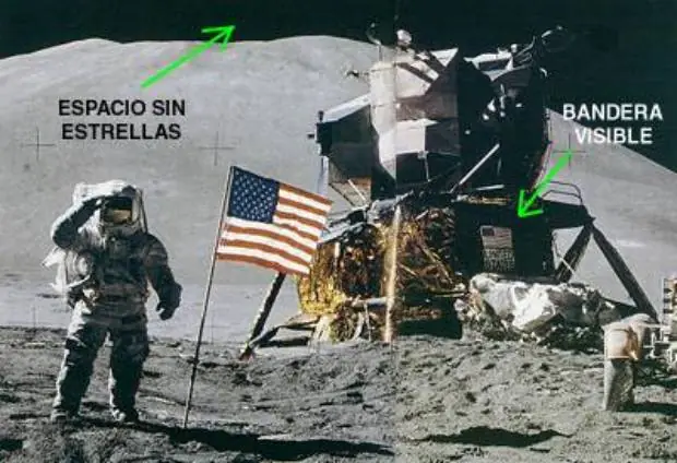 Maria Blyzinky, directora de astronomia del observatorio de Greenwich (Londres), afirma que en la Luna, a falta de atmósfera las estrellas son totalmente visibles y tienen mayor brillo. Pero en esta imagen, no se ve ninguna. La Nasa se defiende diciendo que la luz solar era tan intensa que anulaba el de las estrellas.