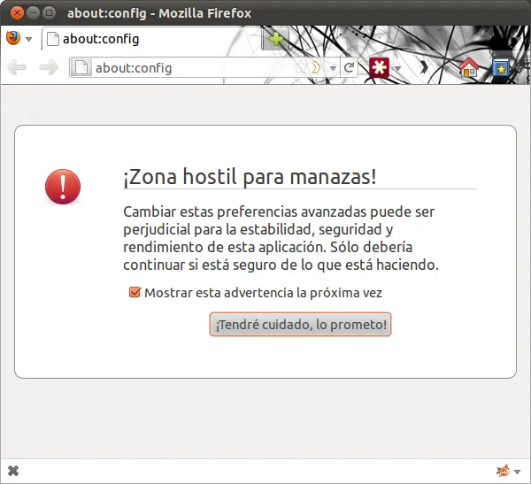 1.- en la barra de direcciones escribimos: “about:config” y pulsamos “Enter”, y nos aparecerá el siguiente mensaje hostil