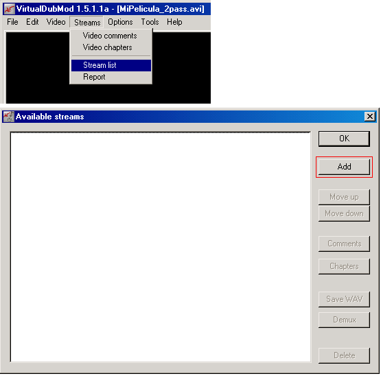 3.En el menú "Streams”, mediante la opción "Stream list”, accederemos a la siguiente ventana, en dónde podremos añadir los "streams" que deseemos a nuestro vídeo, en nuestro caso, las dos bandas de audio que hemos extraído de los ficheros *.vob.