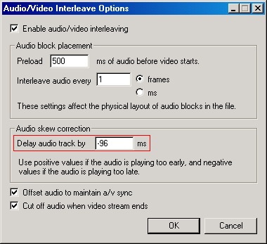 Pulsando en la opción "Interleaving...", introduciremos el desfase existente entre el vídeo y el audio y pulsaremos el botón "OK". Este desfase nos lo dice el propio nombre del fichero de audio, (en el caso de que lo hayamos generado con el DVD2AVI o el BeSweet). En mi caso son -96 ms.