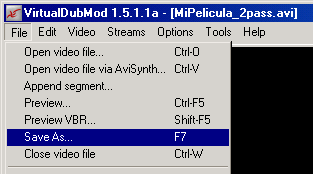5.Por último, sólo nos queda salvar el fichero con el nombre definitivo de la película, (tendremos la precaución de salvarlo con un nombre distinto al del fichero *.avi inicial, p.e. MiPelicua.avi). Para ello, nos iremos al menú "File” y con la opción "Save as AVI...” lo salvamos.