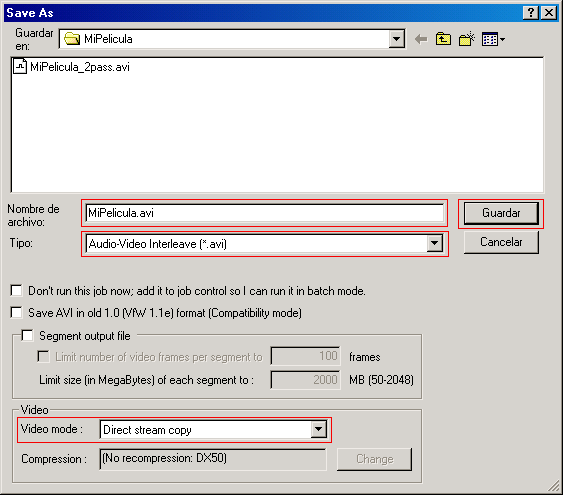 Damos nombre al fichero *.avi, que queremos que nos genere, (p.e. MiPelicula.avi).