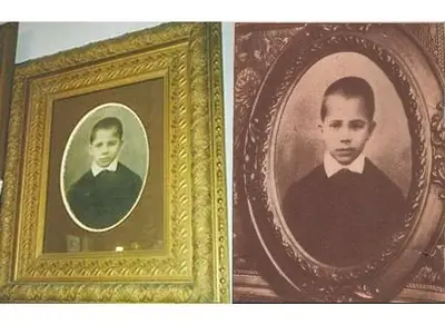 A la izquierda el cuadro actual con el retrato oval que figura en las nuevas ediciones de libros sobre Gardel como su retrato de niño.