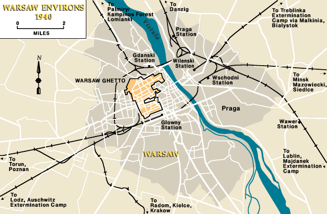 - La mayoría de los edificios del gueto fueron barridos a ras del suelo. En el sitio se estableció el campo de concentración de Varsovia, que se utilizó para encerrar polacos y funcionó también como campo de fusilamiento.