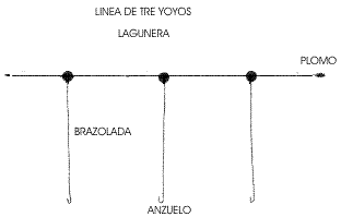 La madre, 2 yoyos,1 zanahoria y el plomo segun lo necesite, ademas el yoyo le permite dar la profundidad que desee en el anzuelo.