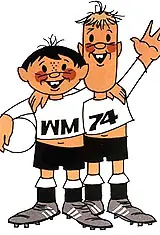 Tip y Tap continúan la linea de mascota-humano en Alemania 1974. Se trata de dos niños alemanes, muy sonrientes. Uno moreno y el otro rubio, la cabeza de éste último muy parecida a una salchicha. Vestidos en los colores básicos del uniforme alemán, tenían en sus camisetas las leyendas “WM” y “74″… Weltmeisterschaft ‘74.