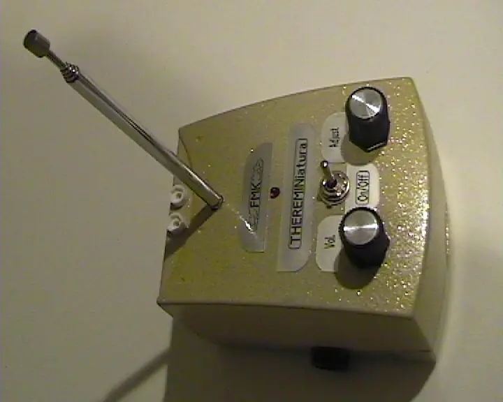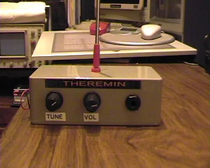 Se trata de un Theremin de una sola antena. Los Theremines "clásicos" llevan dos: una para el volumen y otra para la nota. Este sólo lleva la última, pues el volumen lo manejaremos con un potenciómetro. También lleva un potenciómetro de ajuste de tono... es como para "afinar" el Theremin.