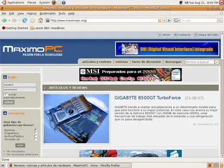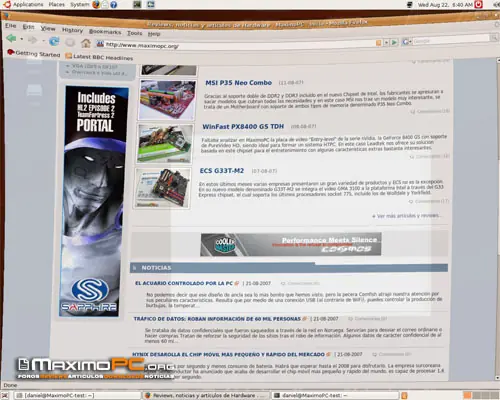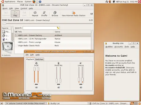 Como podemos ver, nuestro sistema fué totalmente detectado sin problemas, podemos utilizar Radios Online en Internet, conectarnos al MSN mediante una aplicación llamada Gaim (que ademas de permitirnos utilizar MSN, nos permite utilizar YAM, ICQ y todos los protocolos de comunicación, todos al mismo tiempo). El controlador de Audio fué detectado exitosamente por ALSA (que es uno de los tantos sistemas de audio que dispone linux similar al DirectSound de Windows) como HDA NVIDIA Audio.