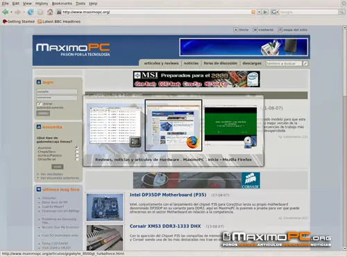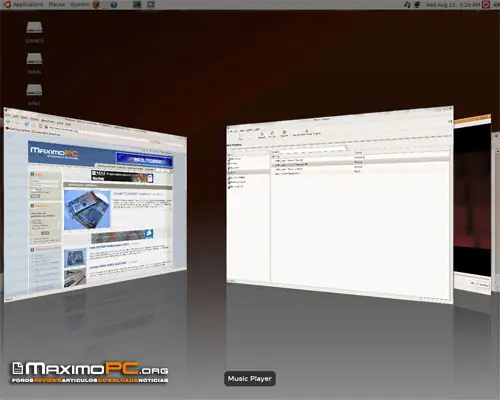 También podremos cambiar escritorios, mientras que en Windows Vista debemos comprar otro monitor para tener mas de un escritorio, en Ubuntu y en todas las distros de Linux tenemos 4 escritorios virtuales por defecto, pero podremos ponerle hasta 16 !!, el Plugin Expo es el encargado de permitirnos cambiar entre escritorios con los 4 paneles abiertos (observen las reflexiones de cada cosa abajo), las ventanas pueden arrastrarse con facilidad de un escritorio a otro (expo se activa con tecla Win+E), cuando activamos desactivamos expo, la pantalla vuelve en modo "zoom" hacia donde dejamos por ultima vez el Mouse, así que pasamos de un escritorio a otro con toda facilidad