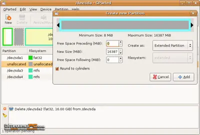 La mejor idea para crear particiones de Linux dentro de un sistema que será usado también en Windows es crear una Partición Extendida donde dentro colocaremos todas las particiones lógicas que querramos, para lo cual le definimos un espacio total de 16Gb.