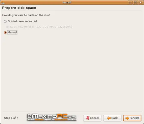 Como nosotros elegimos crear las particiones manualmente, aquí eligiremos "Manual"